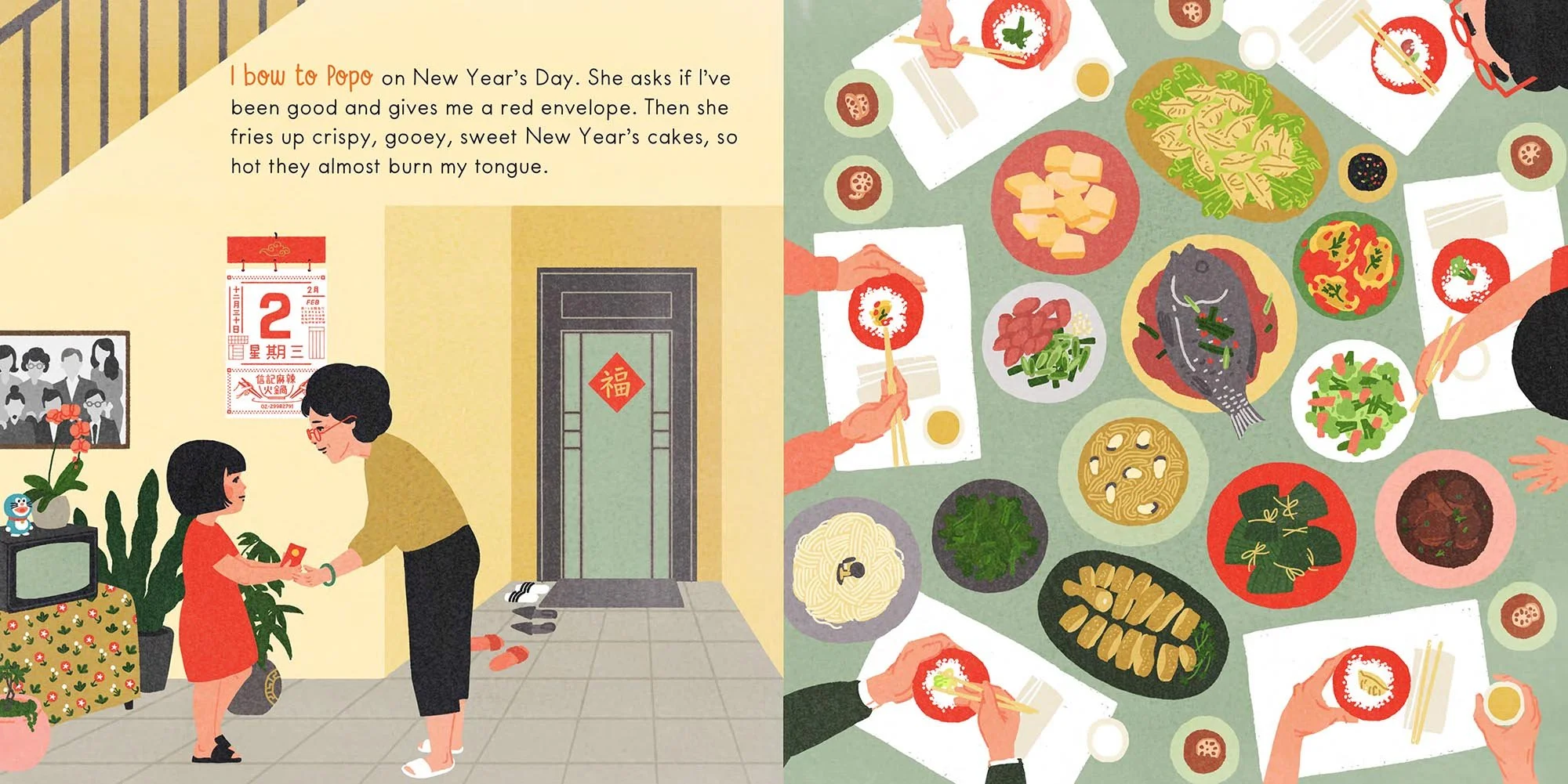 "...Faithful representations of Chinese-language signage, street scenes, and cityscapes evoke nostalgia for those familiar with Taiwan and its vibrant food culture. Whimsical depictions of Chinese New Year at home and Popo’s kitchen are authentic, down to the accurate details on a calendar, dumpling making from scratch, and the iconic rice cooker. Readers will connect with this visual story on various levels or learn something new; possibly both.